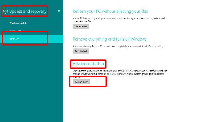 Windows 8的:在Windows 8中,你需要进入通用PC设置,并选择高级启动,然后点击立即重新启动: