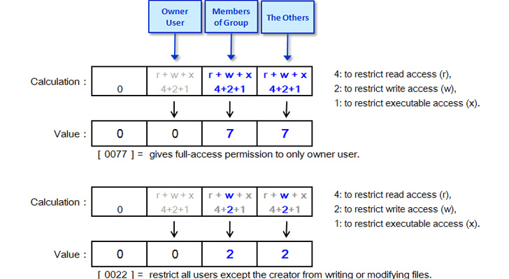 上面的意思可以解释成任何基于 Linux 的操作系统为新建文件(包括文件夹)添加默认权限的规则。出于教育目的,下面列出了一些可以用来设置文件权限的八进制值掩码