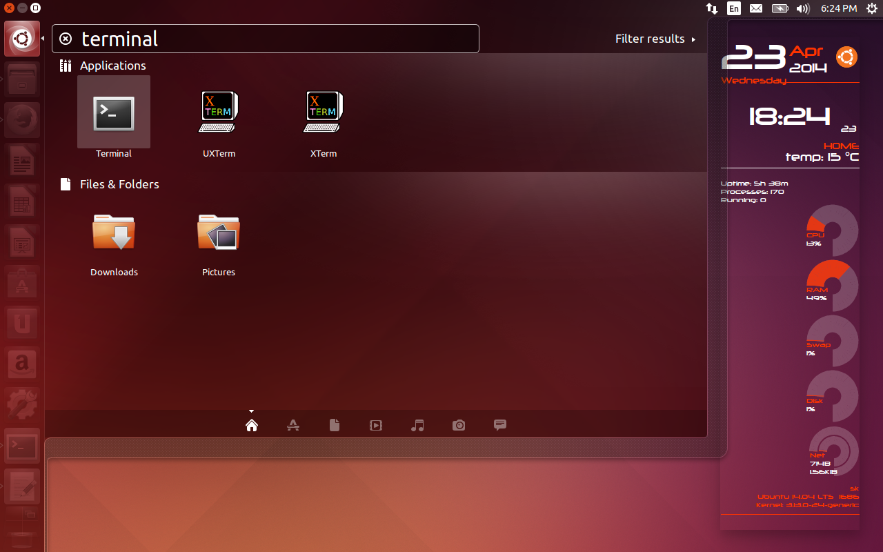 再次,我进入到 Unity dash 的终端。现在 Unity 只显示终端应用,而不是无用的垃圾,现在 Unity Dash 看起来还不错。