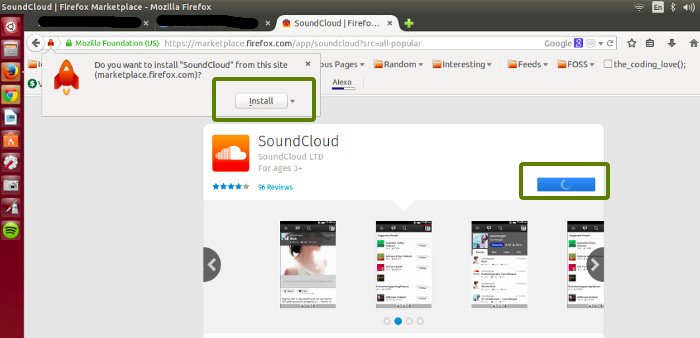 Firefox应用市场是Chrome商店的替代品,类似于Firefox网页浏览器的应用市场,里面提供了一些用于Firefox智能手机OS的应用。在Firefox应用市场中搜索声云(SoundCloud),点击安装(install)来安装,并作为Web应用添加到Ubuntu中。