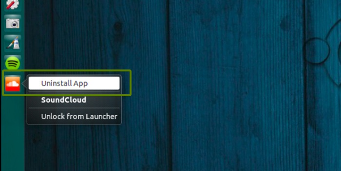运行声云(SoundCloud),在Unity启动器上右击声云(SoundCloud)图标,然后点击卸载应用(uninstall app)。