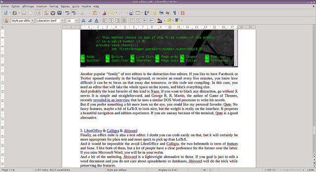 最后,办公套件也是文本编辑器。我不确定你能否轻松使用办公套件编程,但是它确实更适合纯文本编辑,也比LaTeX更容易学习。在这类编辑器中,LibreOffice 和 Calligra 不能避而不谈。这两个编辑器因为它们丰富的特性和响亮的名声成为这类编辑器中的巨兽。这两者我都喜欢,但是很多人明确的偏向于前者。如果你怀念微软的Word处理软件,你会有自己的选择。稍处下风的Abiword相对前面的两个是一个轻量级的选择。如果你的目的只是编辑一个文本文档,不关心电子表格或者数据库,Abiword的特性可以达到理想的效果。
