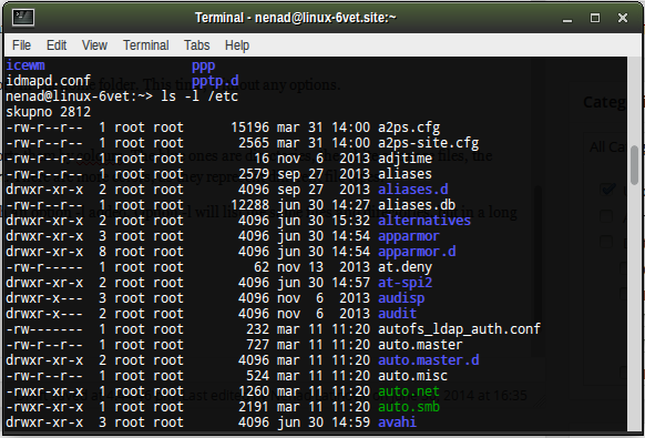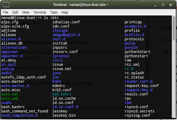 接着,让我们尝试在主目录里尝试用 ls 命令列出 /etc 目录内容。这次我们先不添加选项。
