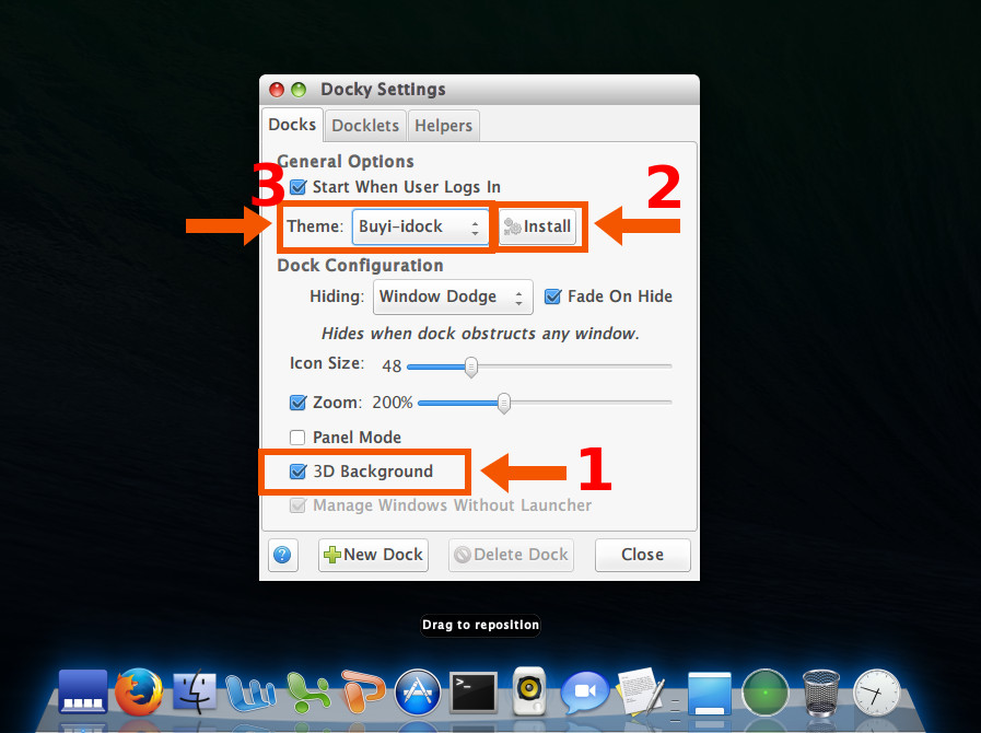 下载 Mac 主题从unity启动器上运行docky。你就能看到docky运行再你的屏幕底端了,点击第一个docky配置按钮,选择3D mode点击下载主题按钮在上面选择Buyi-idock主题,现在你将会获得Mac OS X很像的dock了。
