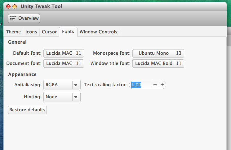 配置: 启动tweak tool在字体选择上选择苹果系列的字体或者lucida Mac 字体,然后根据你的屏幕来调整字体。