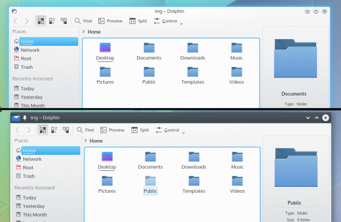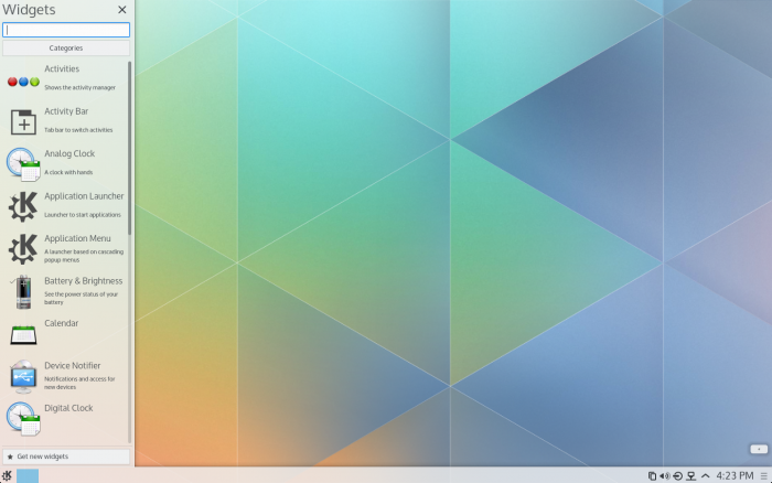 全部界面发生了极大的变化 ———— 更大的字体,更好的对比度,以及一种全新的平面布局,其“磨砂”外观有点类似并且介于 OS X Yosemite、Android L 还有 KDE 4.x 的风格。这并不是说 KDE 抄袭了苹果或者谷歌。这不可能是抄袭,因为 Plasma 5 和 Breeze 主题发布了很长时间之后苹果核谷歌那里才透漏出些许 Yosemite 还有 Android L 的信息出来。