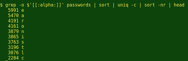 在 passwords 文件中出现最频繁的字母依次是EARONISTLC,类似于EAIRTONSLC,这是至少一个出版的表格中提到的常用英文单词中出现的字频。这是否意味着,大部分密码其实是一些常见的英语单词呢,也许会参杂一些数字呢?