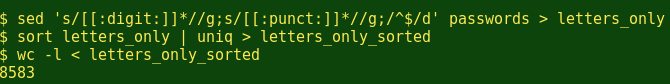首先我将通过 sed 命令删除所有密码中的数字,然后删除所有的标点符号,再删除所有的空行。这将创建出一个纯字母的密码列表。然后我通过sort 和 uniq来修剪列表的排序,将重复项取出。(例如,‘abc1234def’和’abc1!2!3!def!‘都剔除剩下’abcdef’.) 。根据wc命令,我把1000个密码减至成8583个纯字母的字符串: