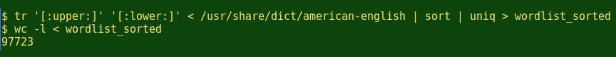 我经常使用一本便携式的英语字典,我通常会使用usr/share/dict/american-english,这个文件是来自Debian Linux的一个发行版本。它包含了99171个单词。我会先通过tr命令将这个词表转换为纯小写的,然后使用sort 和 uniq删除掉任何重复的条目排序(例如’A’ 和 ‘a’ 都将成为 ‘a’)。这样就将词表的数量减至97723项了: