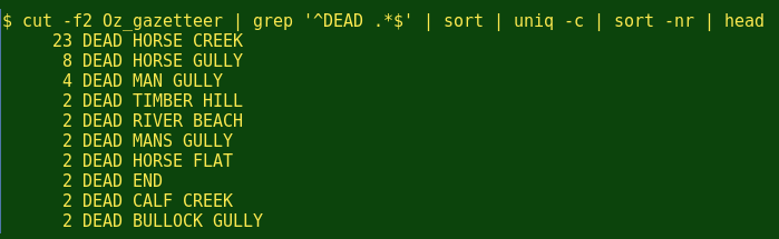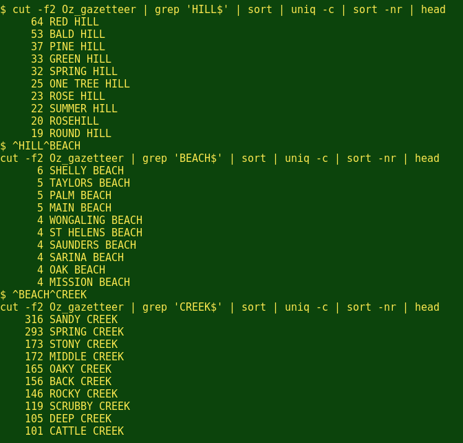 在之前的一篇Linux Rain article,我描述了如何建立一张37万项澳大利亚的地名表。有了它,我现在可以回答一些类似这样的关键问题“Round Hill是澳大利亚山脉中最流行的名字吗?”和“桑迪是沙滩之最,而岩溪峡谷呢?”