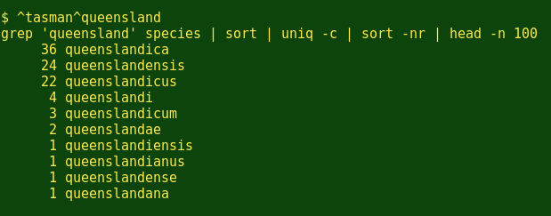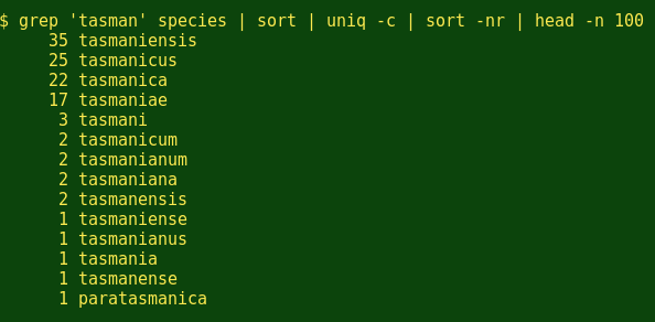 耶!昆虫学家喜欢也‘-us’结尾。接下来,我不知道有多少物种是以我的家乡Tasmania州来命名的?(下面我想看看前100行,来确保我得到的所有’tasman’组合.)