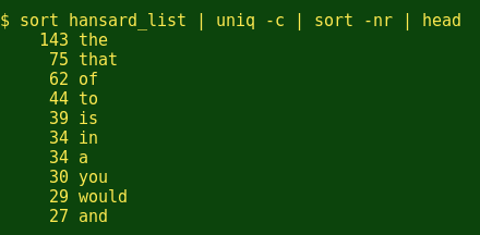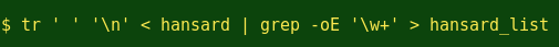 上面的这些命令用在简单列表上。要从简单的列表变成文本块,那就再次需要我们的命令行朋友了。例如,我把澳大利亚参议院于2014年7月16日的演讲保存成文本文件hansard。将hansard分割成一个单词列表: