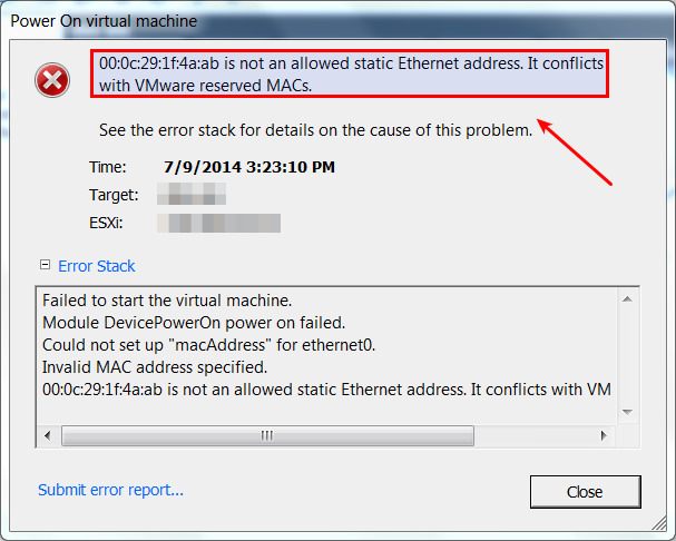 如你上图所见,VMWare的vSphere的GUI客户端已经有一个为虚拟机分配静态MAC地址的菜单。然而,基于GUI的方法只允许你在00:50:56:xx:xx:xx的范围里选择一个静态MAC地址,这是VMWare保留的MAC地址范围。如果你尝试设置任何超出这个范围的MAC地址,你就会无法启动VM,接着就会看到下面的错误。