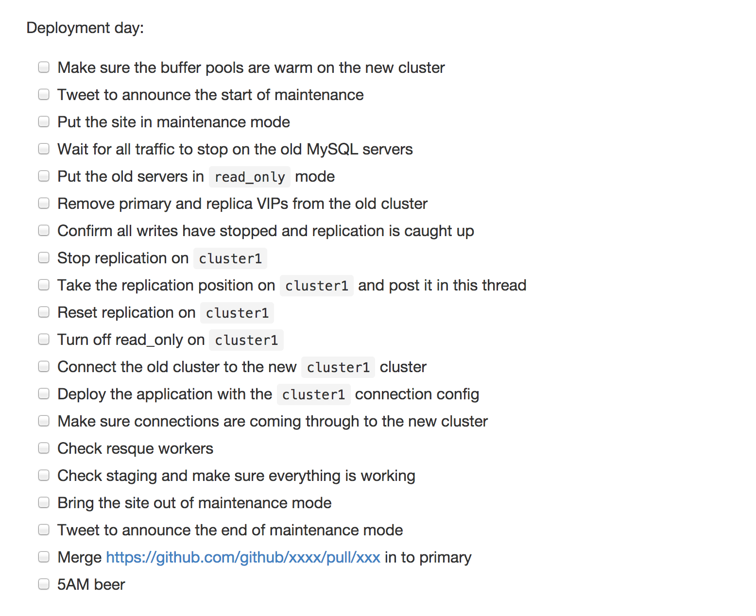 每天有上百万用户的使用 GitHub.com,我们不可能有机会等没有人用了才进行实际数据切换。我们有一个详细的任务清单来执行迁移: