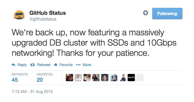 然后我们让 GitHub.com 脱离维护模式,并且让全世界的用户都知道我们的最新状态: