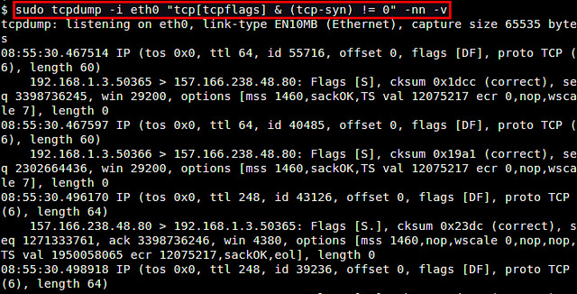 # tcpdump -r <interface> "tcp[tcpflags] & (tcp-syn|tcp-ack) != 0"
