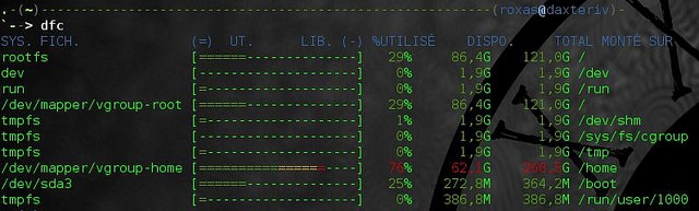 该命令可显示电脑上每一分卷的大小、 已使用空间、 可用空间、 已使用空间百分比和挂载点。 注意, 我们必须使用 “-h” 选项使得所有数据以可读形式显示(使用 GiB 而不是 KiB)。 但你可以使用 dfc 来完全替代 df, 它不需要任何额外的选项就可以得到 df 命令所显示的内容, 并且会为每个设备绘制彩色的使用情况图, 因此可读性会更强。