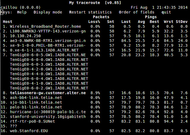 系统管理员的一个基本的网络诊断工具traceroute可以用于显示从本地网络到目标网络的网络第三层协议的路由。mtr(即“My Traceroute”的缩写)继承了强大的traceroute功能,并集成了 ping 的功能。当发现了一个完整的路由时,mtr会显示所有的中继节点的 ping 延迟的统计数据,对网络延迟的定位非常有用。虽然也有其它的 traceroute的变体(如:tcptraceroute 或 traceroute-nanog),但是我相信 mtr 是traceroute 工具里面最实用的一个增强工具。