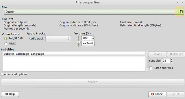 “文件属性”对话框用于添加文件到当前标题。点击文件夹图标(右上角),然后浏览你的计算机以选择想要的文件。你也可以通过点击副标题对话框右边的添加按钮添加一个副标题文件。选择好视频文件(又或者是副标题文件)后,点击右下角的确定。