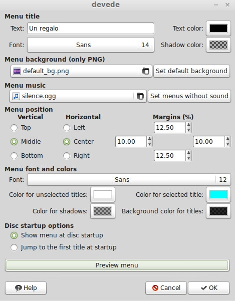 接下来,编辑菜单选项。你可以选择一个背景图片和声音文件,在主菜单显示时播放(在DVD插入播放器时就会出现)。