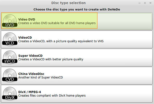 DeVeDe是一个开源(GPLv3)DVD创作软件,它允许你从任何数量的视频文件创建视频DVD、VCD、SVCD或者DivX。DeVeDe依赖于其它如Mplayer、FFMpeg、MEncoder、DVDAuthor、VCDImager以及MKisofs之类的软件来进行格式转换。就这点而论,它支持各种各样的主流输入视频/音频格式(如.mp4,.avi,.mpg,.mkv)。你可以在PAL和NTSC视频格式之间选择,也可以田间菜单或字幕。