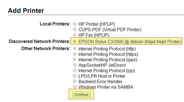 3、 选择你的打印机;在本例中,EPSON Stylus CX3900 @ debian (Inkjet Inkjet Printer),然后点击继续: