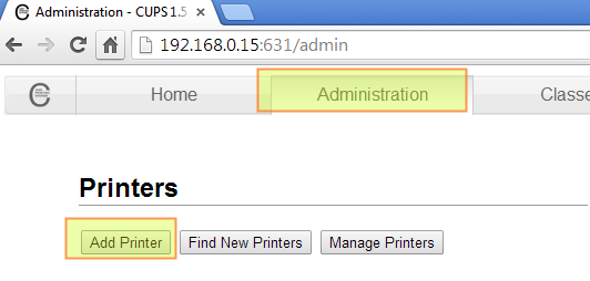 1、 启动网页浏览器,并打开CUPS接口http://:Port,这里在我们的例子中是http://192.168.0.15:631: