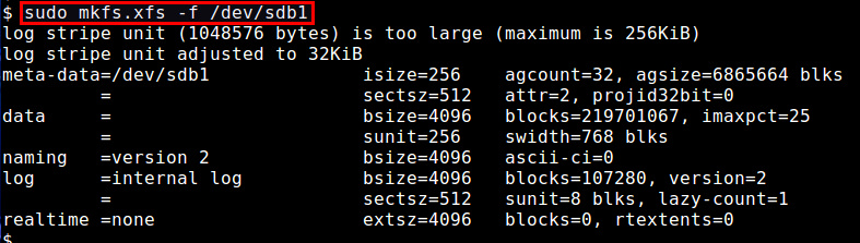 $ sudo mkfs.xfs -f /dev/sdb1