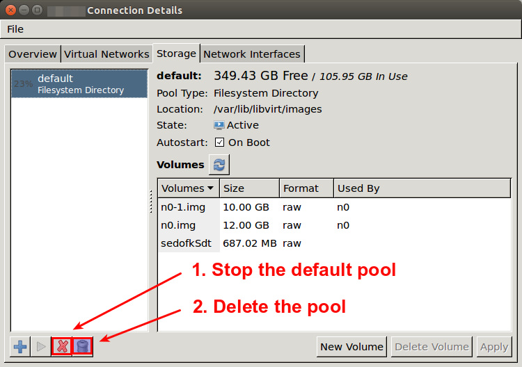 你可以看到如下所是的默认存储池。在窗口的左下角,点击叉形按钮,将会停止默认的存储池。存储池一旦停止后,点击右边的垃圾桶,将会删除存储池。注意这个动作不会删除池中的镜像。