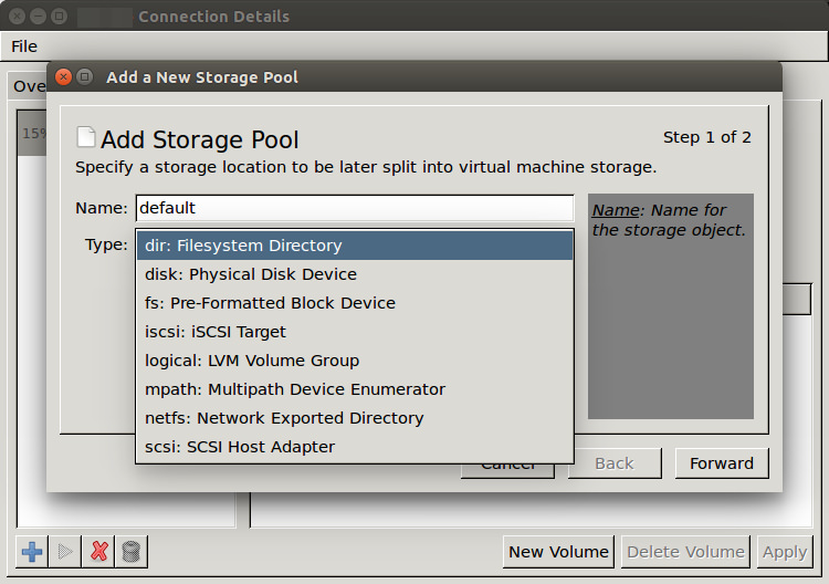输入新的存储池的名字(比如:default),并且选择存储池的类型。本例中,因为我们只是改变存储池目录所以选择“文件系统目录”。