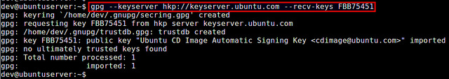 这样做之前,你需要知道公共密钥的 “key ID”,而这在上面的 gpg 命令的输出中有显示。在这个例子中,密钥 ID 时 “FBB75451”。运行下面的命令来从官方 Ubuntu 密钥服务器导入公共密钥。