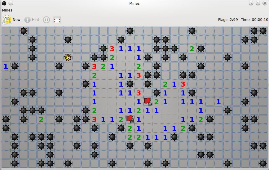 KMines是一个KDE游戏,和GNOME Mines类似,有三个内建表尺寸(简易、中等、困单),也可以自定义,支持主题和高分。