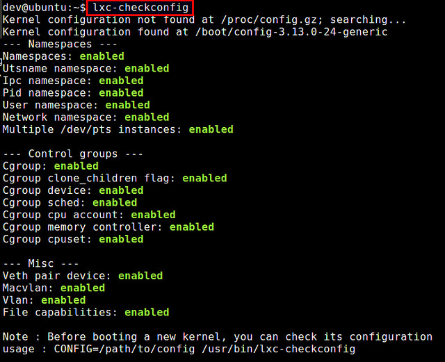 然后检查当前内核是否支持 LXC。如果所有结果都是“enable”,说明内核支持: