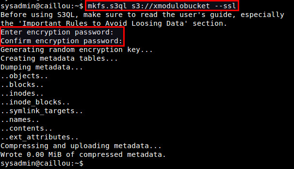 使用 mkfs.s3ql 工具来创建一个新的 S3QL 文件系统。这个命令中的 bucket 名应该与 authinfo2 文件中所指定的相符。使用“–ssl”参数将强制使用 SSL 连接到后端存储服务器。默认情况下,mkfs.s3ql 命令会在 S3QL 文件系统中启用压缩和加密。
