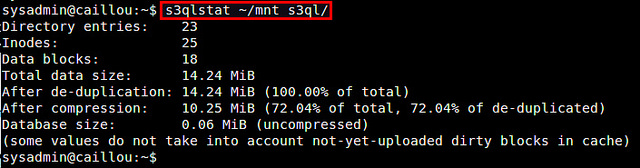 若要查看 S3QL 文件系统统计信息,你可以使用 s3qlstat 命令,它将会显示诸如总的数据、元数据大小、重复文件删除率和压缩率等信息。