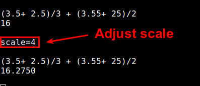 在bc中,数字的精度存储在一个名为scale的特殊变量中。该变量表示小数点后数字的个数。scale默认为0,意味着所有的数字和结果以整数形式储存。你可以通过改变scale这个特殊变量的值,来调整数值的精度。