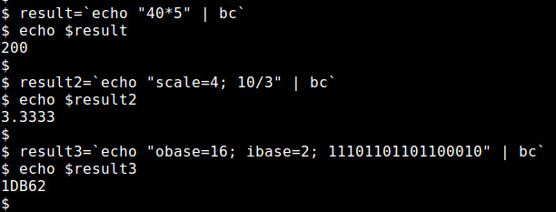 到目前为止,我们一直在交互界面下使用bc。不过更加流行的使用bc的方法是在没有交互界面的脚本中运行bc。这种情况下,你可以使用echo命令并且借助管道来向bc发送输入内容。例如: