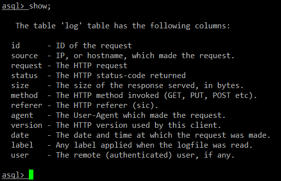 当 asql 完成对 access 日志的加载后,我们就可以开始数据库查询了。注意一下,加载后生成的数据库是 “temporary” (临时)的,意思就是数据库会在你退出 asql 的时候被清除。如果你想要保留数据库,你必须先将其保存为一个文件。我们会在后面介绍如何这么做(参考 example 3 和 4)。