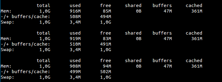 free是另一个能够在终端中显示内存和交换空间使用的命令行工具。由于它的简易,它经常用于快速查看内存使用或者是应用于不同的脚本和应用程序中。在这里你可以看到这个小程序的许多应用。几乎所有的系统管理员日常都会用这个工具。:-)