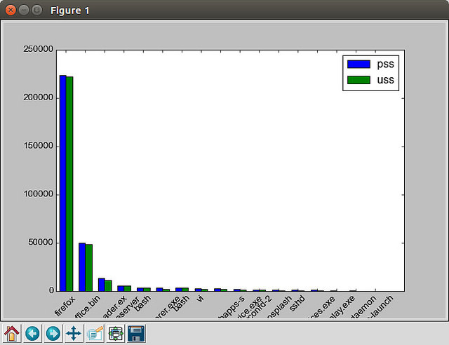 smem是一个能够生成多种内存耗用报告的命令行工具,它从/proc文件系统中提取各进程的PSS/USS信息,并进行汇总输出。它还内建了图表的生成能力,所以能够方便地分析整个系统的内存使用情况。
