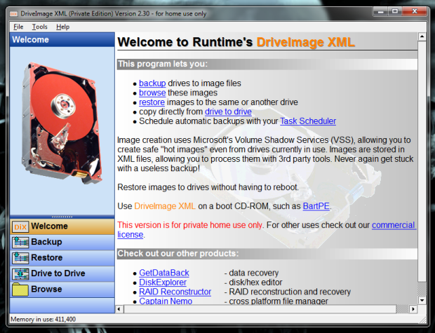 DriveImage XML 使用 Microsoft VSS 来创建镜像,十分可靠。使用这个软件,你可以从一个正在使用的磁盘创建“热”镜像。镜像使用 XML 文件保存,这意味着你可以从任何支持的第三方软件访问它们。DriveImage XML 还允许在不重启的情况下从镜像恢复到机器。这个软件与 Windows XP、Windows Server 2003、Vista 以及 7 兼容。
