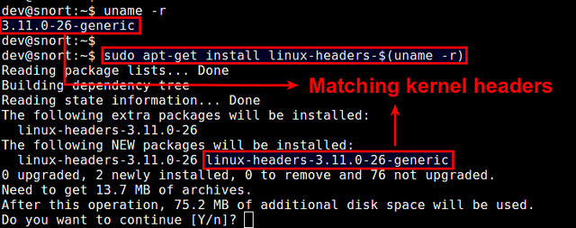 当你在编译一个设备驱动模块时,你需要在系统中安装内核头文件。内核头文件同样在你编译与内核直接链接的用户空间程序时需要。当你在这些情况下安装内核头文件时,你必须确保内核头文件精确地与你当前内核版本匹配(比如:3.13.0-24-generic)。