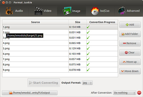 就像下方展示的一样,Format Junkie 的用户界面简单而且直观。在顶部的音频、视频、图像和iso媒体四个标签当中点击你需要的那个。你可以根据需要添加任意数量的文件用于批量转换。添加文件后,选择输出格式,直接点击 “Start Converting” 按钮进行转换。
