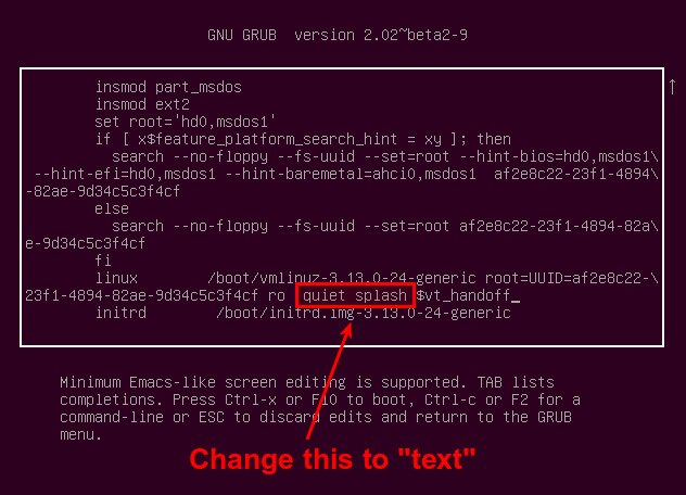 接着会进入下一屏,这里你可以修改内核启动选项。向下滚动到以“linux”开始的行,这里就是内核参数的列表。删除参数列表中的“quiet”和“splash”。在参数列表中添加“text”。