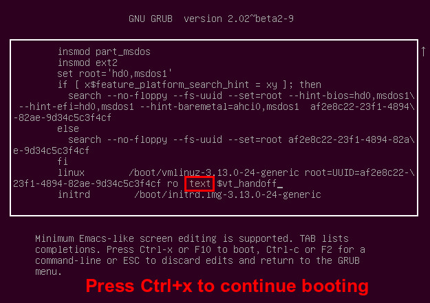 升级的内核选项列表看上去像这样。按下Ctrl+x继续启动。这会以详细模式启动控制台一次(LCTT译注:由于没有保存修改,所以下次重启还会进入 GUI)。