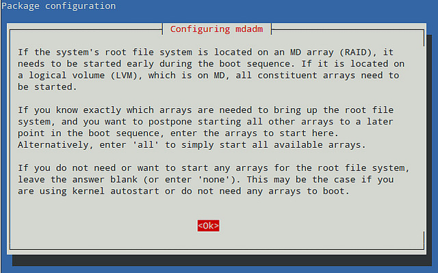 Debian系统中,需要在/etc/default/mdadm 设置 AUTOSTART 变量为 true 才能使mdadm守护程序在开机时自动加载阵列: