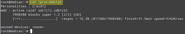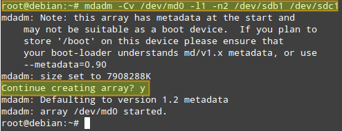 # mdadm -Cv /dev/md0 -l1 -n2 /dev/sdb1 /dev/sdc1