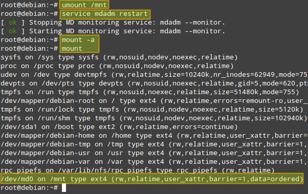 为了验证挂载脚本工作正常,我们首先卸载阵列,重启mdadm,然后重新加载。可以看到/dev/md0已经安装我们添加到/etc/fstab中的条目加载了: