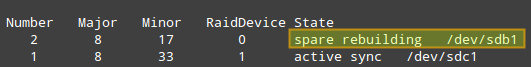 ‘mdadm -D’命令提供的信息中,最重要就是阵列状态类。激活状态说明阵列正在进行读写操作。其他几个状态分别为:完成(读写完成)、降级(有一块磁盘失效或丢失)或者恢复中(一张新盘已插入,系统正在写入数据)。这几个状态涵盖了大多数情况。