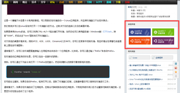 本次实验楼将为Linux中国网站上的技术文章提供配套的在线实验环境,目前已上线Ubuntu14.04、Ubuntu Server、CentOS 6、CentOS 7四种最常见的在线linux系统。
